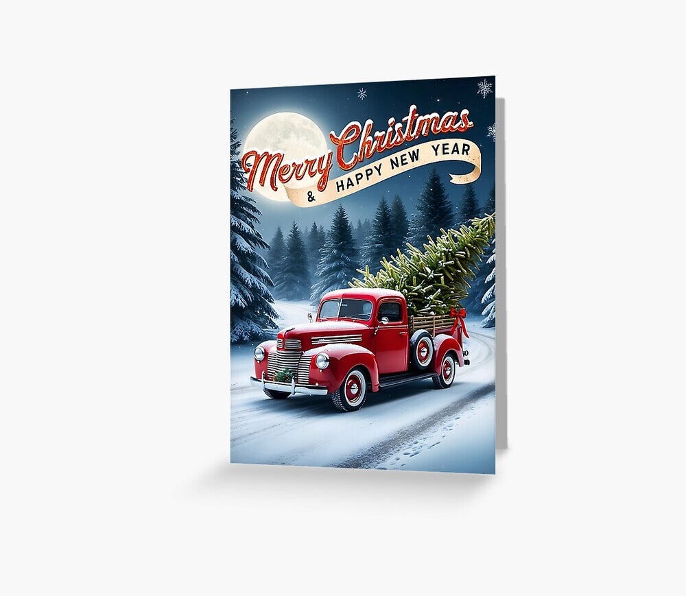 This nostalgic design features a classic red pick-up truck carrying a Christmas tree through a snowy landscape. With a full moon, sparkling snowflakes, and the words Merry Christmas & Happy New Year, it radiates warmth, tradition, and festive charm.