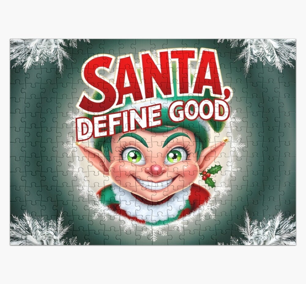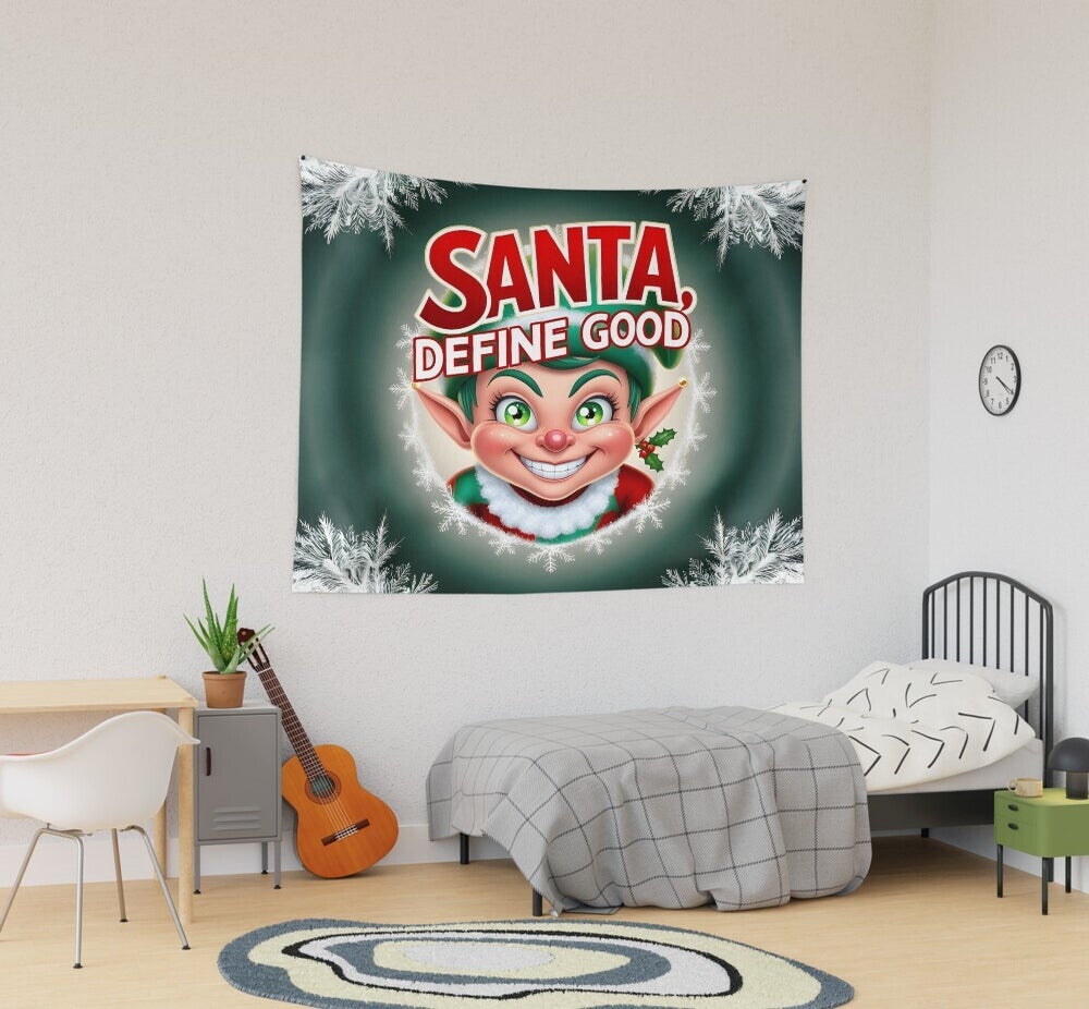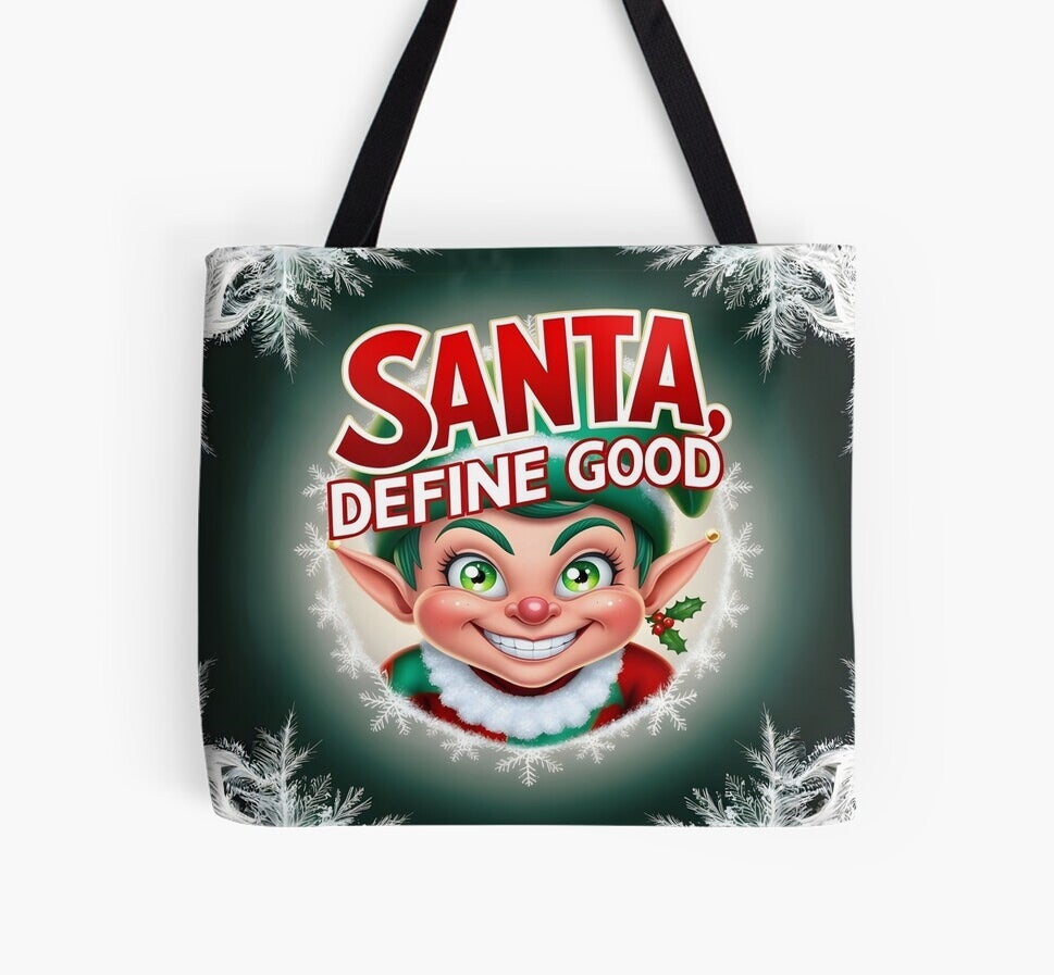With a wide grin and mischievous eyes, this elf brings the phrase “Santa, Define Good” to life. A humorous and colorful design that adds playful fun to the holidays.