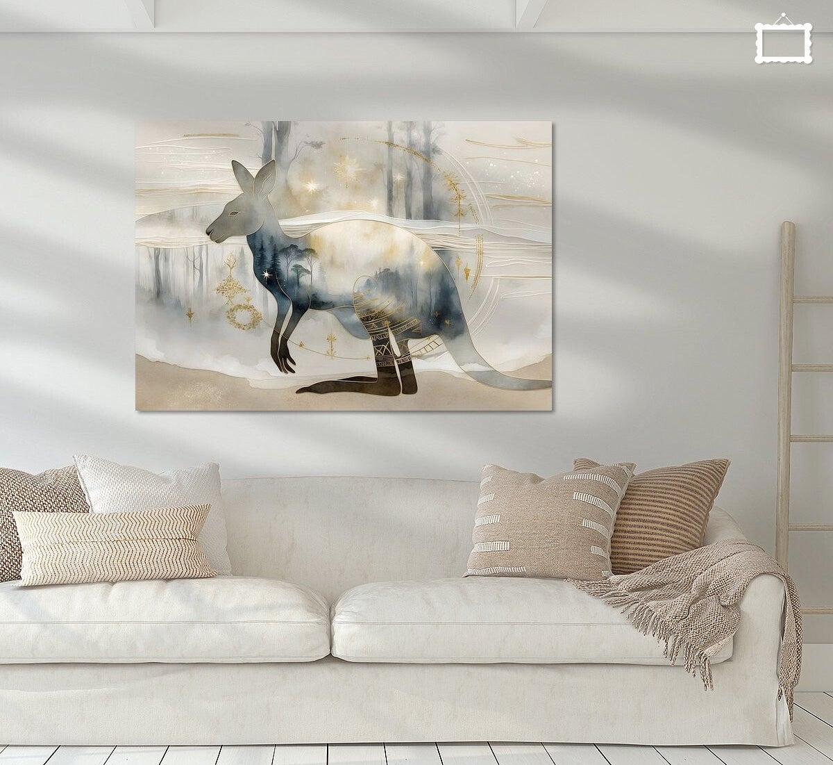 In this dreamlike composition, mythology merges with the Australian wilderness. Marlu, the kangaroo, stands as a silent guardian between worlds — a symbol of strength, resilience, and the courage to leap forward. Surrounded by golden light and stardust, this ethereal protector embodies the art of moving gracefully through change. Misty forests and layered textures weave a story of inner growth and deep connection to Mother Earth.