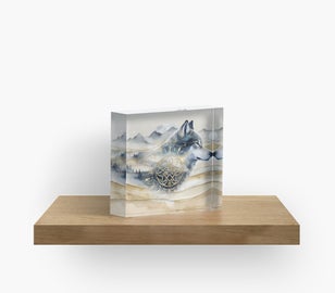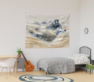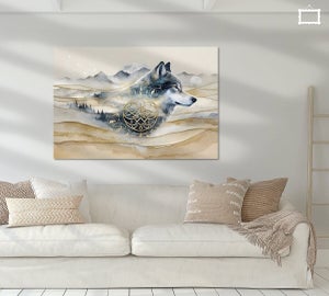 In this majestic artwork, the spirit of Amarok, the mythical wolf guardian of Inuit legend, awakens. His gaze reflects the wisdom of the moon and the strength of solitude that leads to inner clarity. Surrounded by golden symbols and mountain silhouettes, this guardian invites stillness, intuition, and trust in your path. The Wolf reminds us that true guidance arises from within — from the quiet of the night.