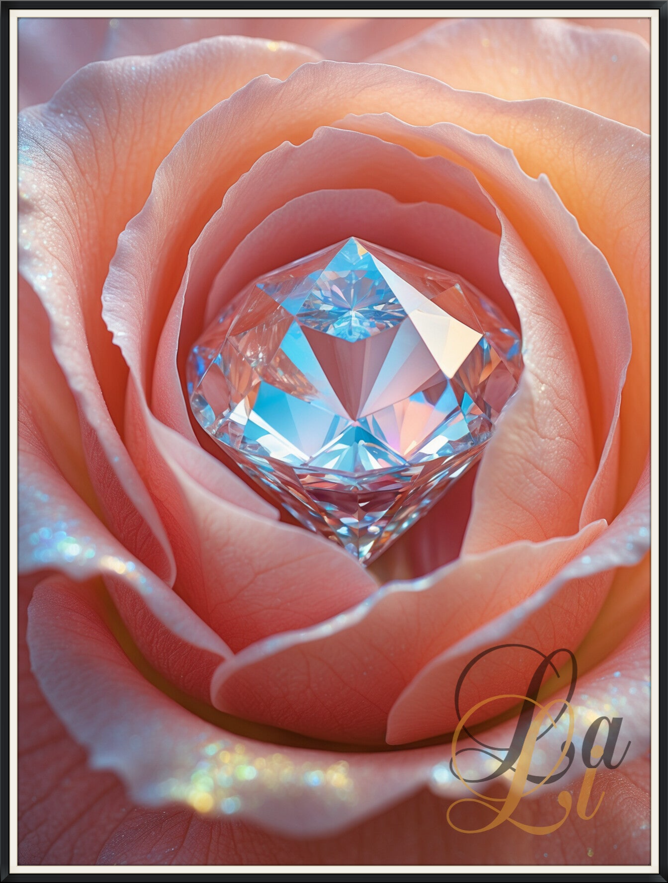 A new fine-art series is awakening within the world of LaLi Designs — a trilogy of roses portrayed in rich macro intimacy. Each bloom carries its own luminous story: a warm salmon rose crowned with a diamond glow, a serene ivory rose holding a heart of clear quartz edged in gold, and a sensual crimson rose shaped with satin petals and a ruby core.