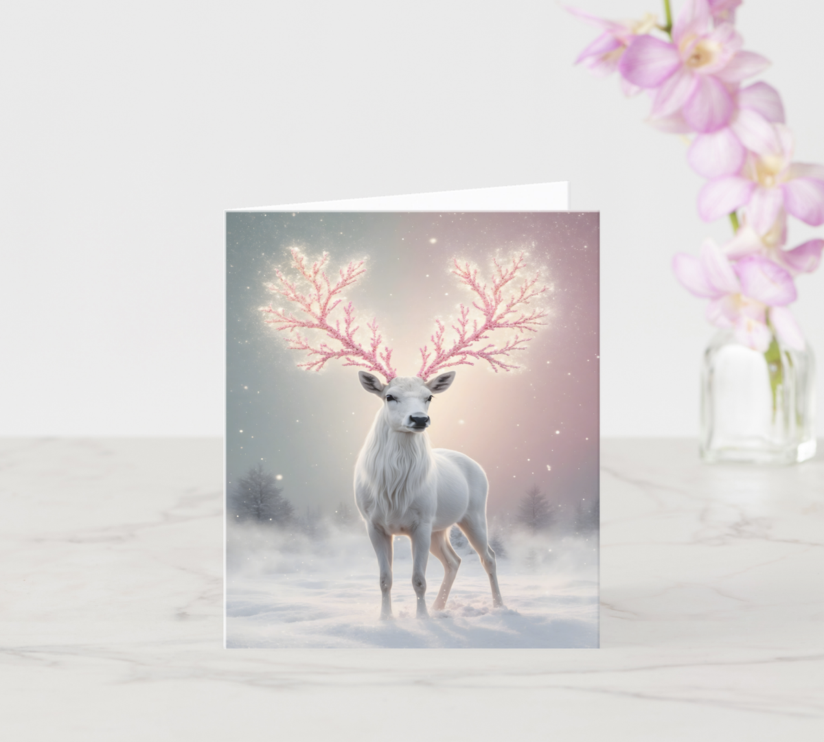 The Surreal Pinkmas Reindeer brings a fairytale atmosphere to the holidays. With its graceful white body, sparkling pink antlers, and dreamy winter background, this artwork embodies elegance and mystical magic.