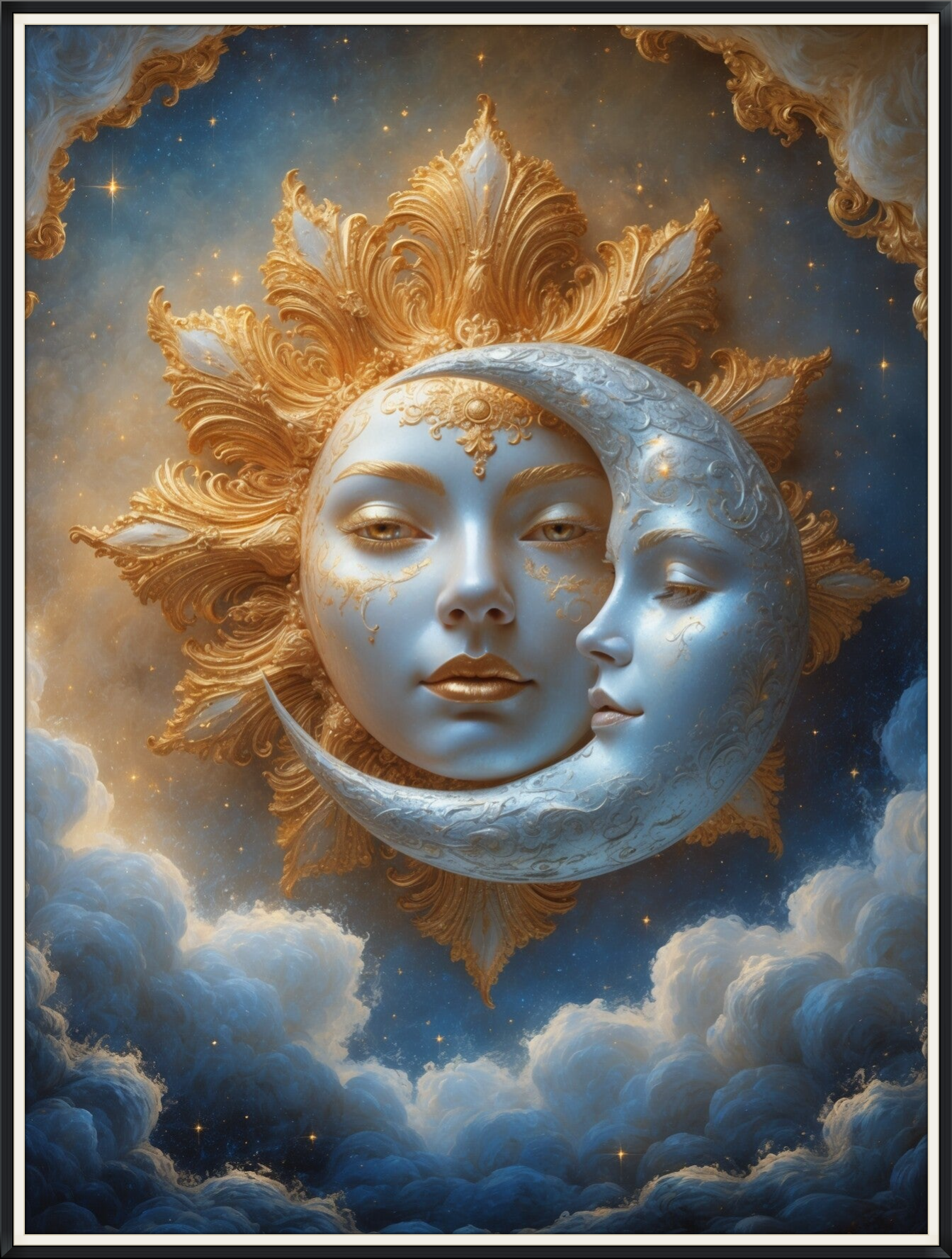 At the heart of this artwork, sun and moon merge into a single celestial presence — light and shadow entwined in a moment of perfect equilibrium. Ornate golden details radiate warmth and power, while soft lunar tones introduce calm, introspection, and quiet depth.